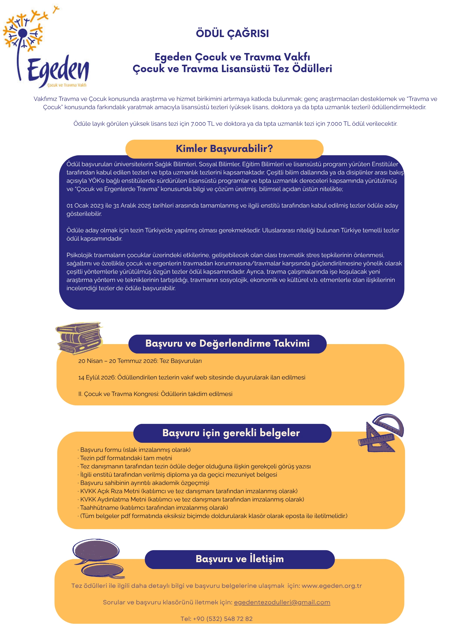 Ödüller; Sağlık, Sosyal, Eğitim Bilimleri ve YÖK’e bağlı enstitülerde yürütülen lisansüstü programlarda ya da tıpta uzmanlık eğitiminde hazırlanmış tezlere açıktır. Çocuk ve ergenlerde travmayı psikolojik, sosyolojik, kültürel ya da disiplinler arası bakış açısıyla ele alan, bilimsel açıdan üstün nitelikteki çalışmalar ödül kapsamındadır.